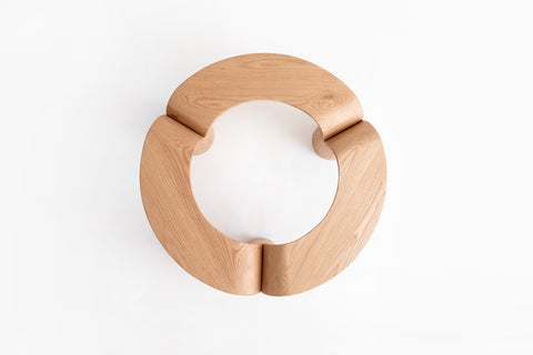 A set of glazed volcanic stone nesting tables that seem to float on their trunk-like chiseled oak pedestals. The owner of the NYC townhouse, Julien C., noted that after one of his friends stopped by for a party they proclaimed, "you have the coolest coffee table I have ever seen".